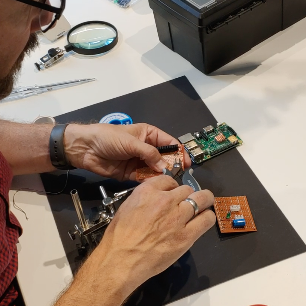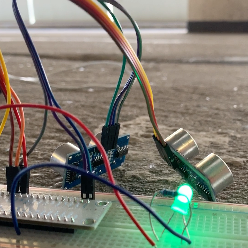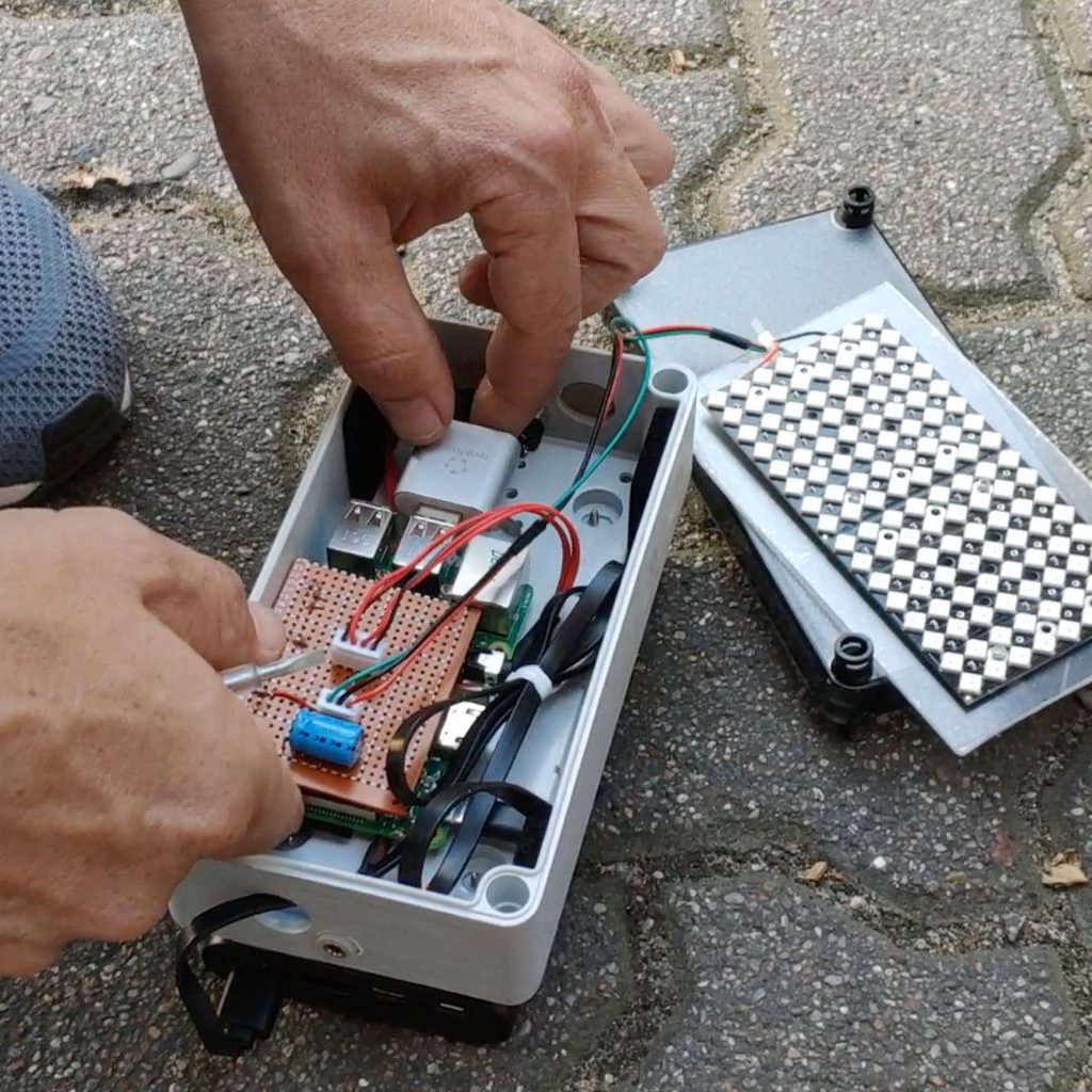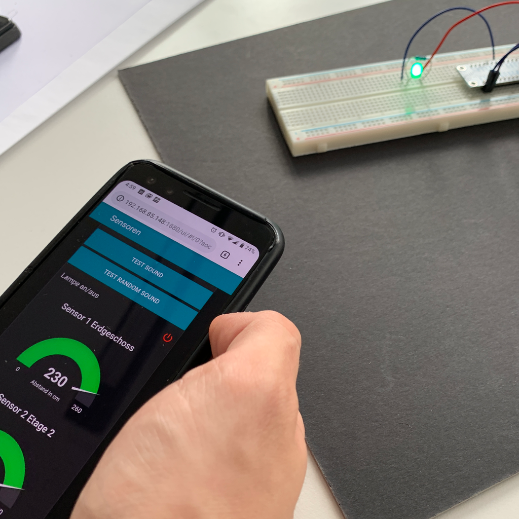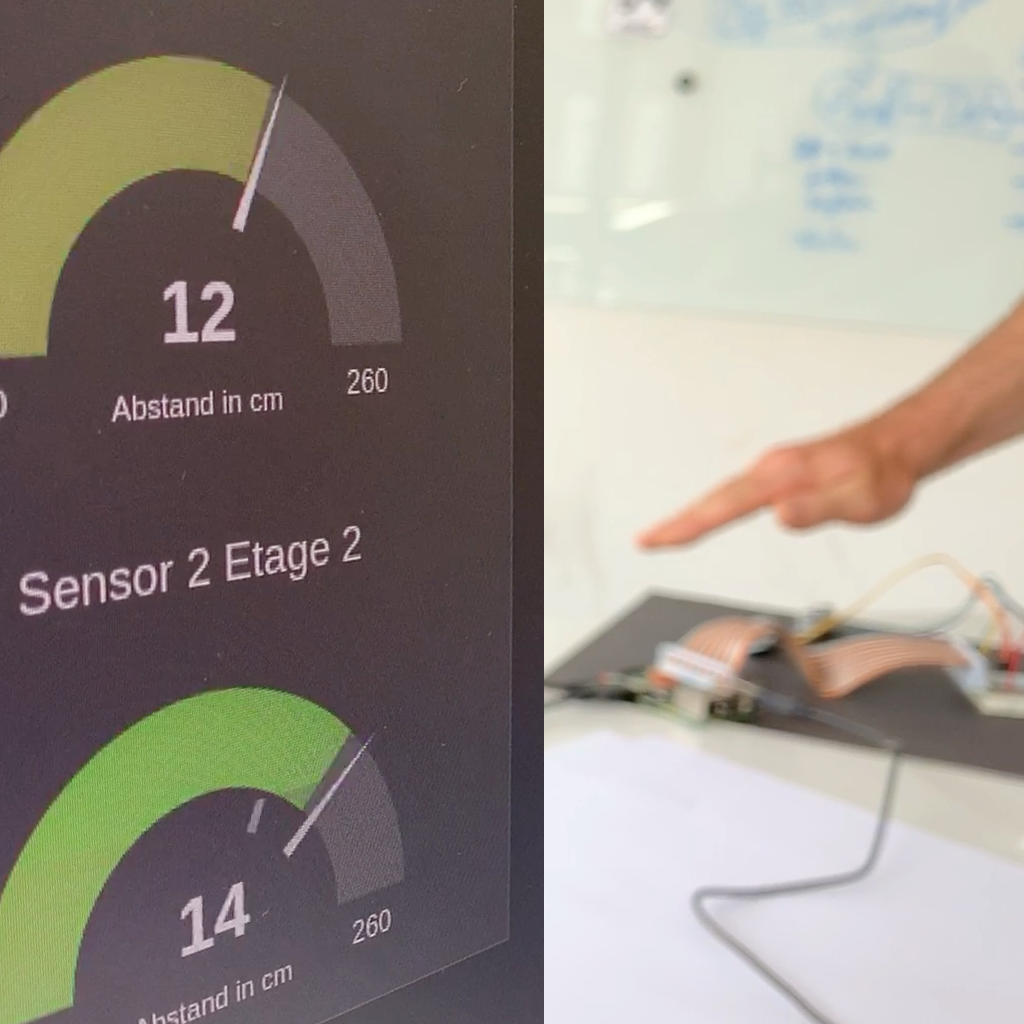 Inside, a Raspberry Pi development board does the job. To quickly adapt to the versatile requirements in the parking garage, we chose to implement it in NodeRED. Through a small breakout board, the Raspberry Pi communicates with the WS2812-based LED display and the robust HC-SR04 ultrasonic distance sensor.