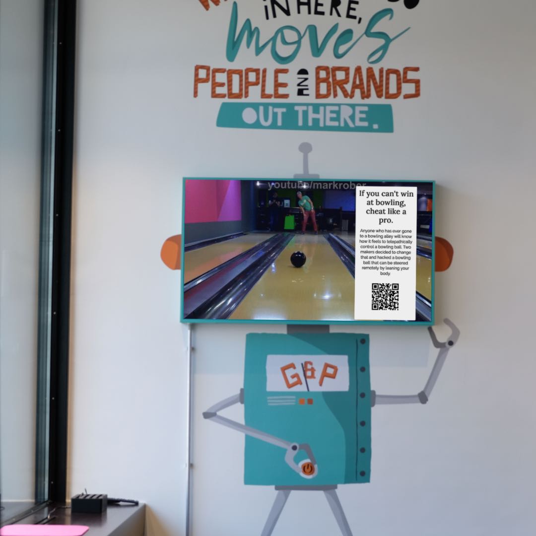 In the agency’s entrance area, clients, passersby, and especially colleagues are greeted by a larger-than-life robot. The friendly machine displays fresh digital, innovation, and tech news on its screen as eye-catching highlights. Beneath the text is a QR code inviting further reading on a smartphone.